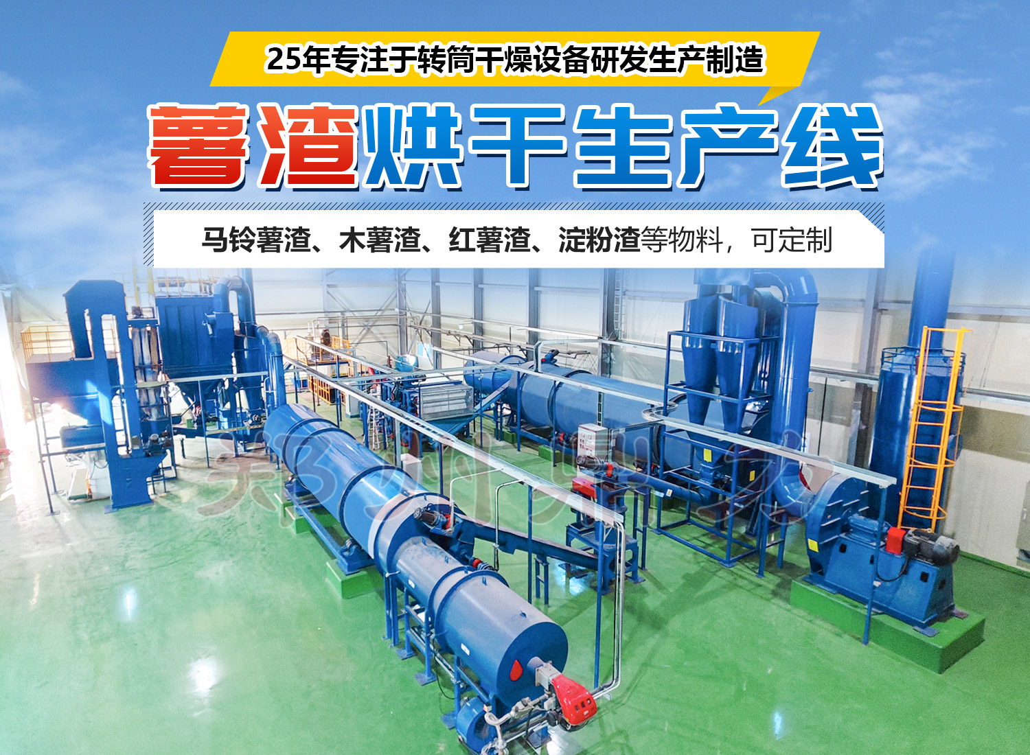 薯渣烘干機(jī)流程是:水分80-85%物料先經(jīng)過專用脫水機(jī),水分脫除到68%左右,由螺旋輸送機(jī)送入攪拌滾筒烘干機(jī)實(shí)現(xiàn)順流烘干,薯渣在抄板下不斷抄起、散落呈螺旋行進(jìn)式前進(jìn),內(nèi)置攪拌槳葉裝置將物料充分?jǐn)嚢璐蛏⑵扑椋浞謹(jǐn)U大物料與熱氣熱交換面積,物料與熱氣充分質(zhì)熱交換,水分迅速蒸發(fā)汽化,達(dá)到35%左右,完成滾筒干燥過程,由螺旋輸送機(jī)排出,進(jìn)入半濕物料專用粉碎機(jī),粉碎物料粒度到1mm以下,進(jìn)入脈沖氣流烘干過程,物料迅速降到12%以下。(可避免物料在烘干過程中糊化、糖化現(xiàn)象發(fā)生,造成物料外觀顏色發(fā)黑),由旋風(fēng)卸料器和脈沖袋式收塵器回收干料粉,廢氣達(dá)標(biāo)排放,完成整個烘干過程。滾筒內(nèi)部安裝有震打清理裝置,防止物料與筒壁粘接。